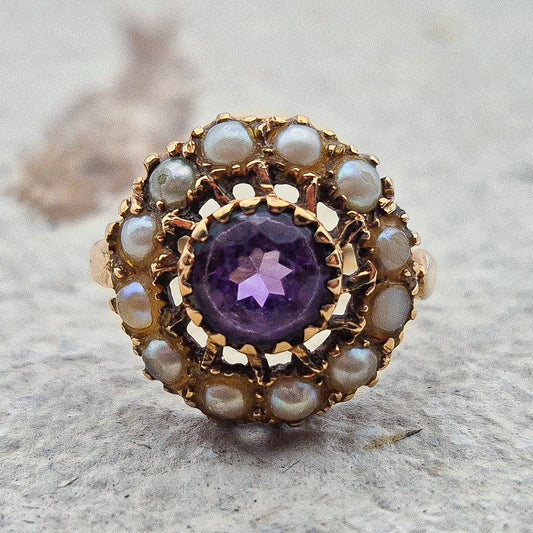 Vintage Seed Pearl and Amethyst Ring |UK Size J | US Size 4.75 | 9 Carat Gold