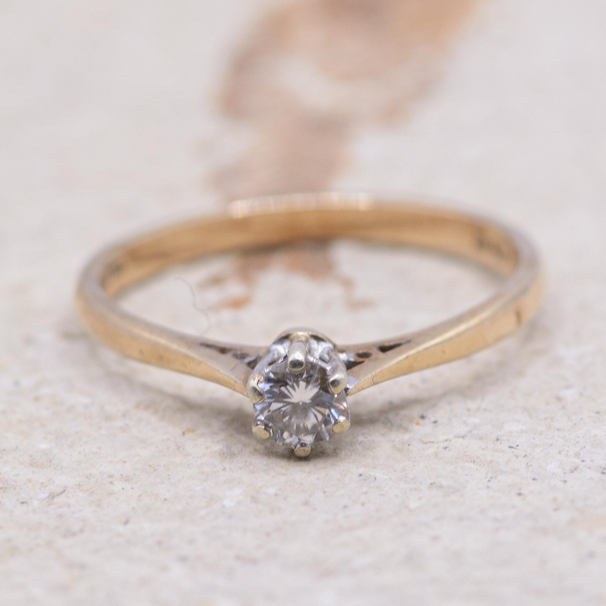 A timeless classic with vintage charm – this 9ct gold diamond solitaire ring, hallmarked in 1986, features a radiant single diamond in a refined and elegant setting. A perfect choice for a vintage engagement, anniversary, or special gift.